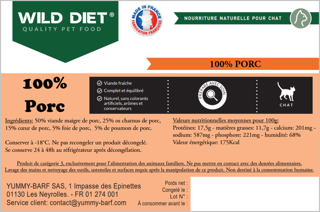 La gamme Wild Diet est fabriquée en France à nos installations de Yummy-Barf, c’est une gamme hautement qualitative formulée par des spécialistes en nutrition carnivore.